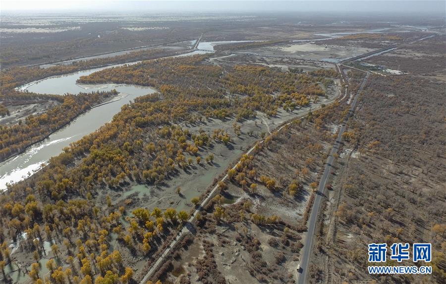 從空中俯瞰新疆尉犁縣喀爾曲尕鄉(xiāng),兩條道路沿著塔里木河岸邊的金色胡楊向前延伸(10月25日無人機拍攝)。 10月中下旬,靜靜的塔里木河中下游一片金黃。胡楊深處,條條小路蜿蜒綿長通向遠方,引人入勝。 塔里木河是中國最長的內(nèi)陸河,這一區(qū)域原始胡楊林分布較為集中。隨著塔里木河連續(xù)19次向下游生態(tài)輸水,為胡楊林“解渴”,塔河兩岸生態(tài)得到明顯改善,沙地面積逐年減少。 新華社記者趙戈攝