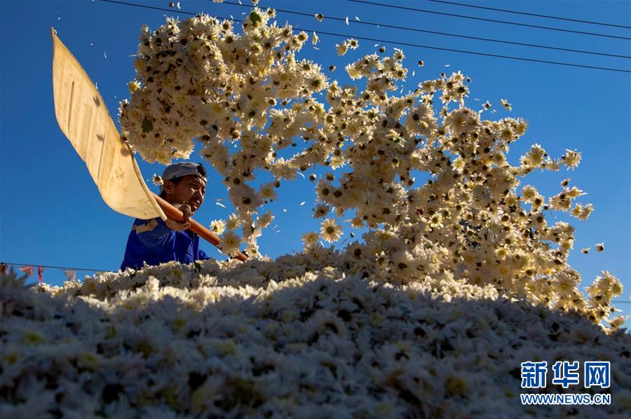 10月30日,武安市午汲鎮(zhèn)東河下村村民在晾曬菊花。 新華社記者 王曉 攝