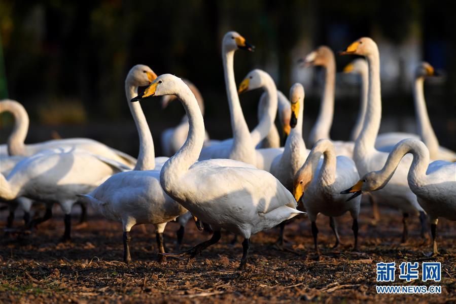 10月31日,大天鵝在山西平陸黃河濕地覓食。新華社記者 楊晨光 攝