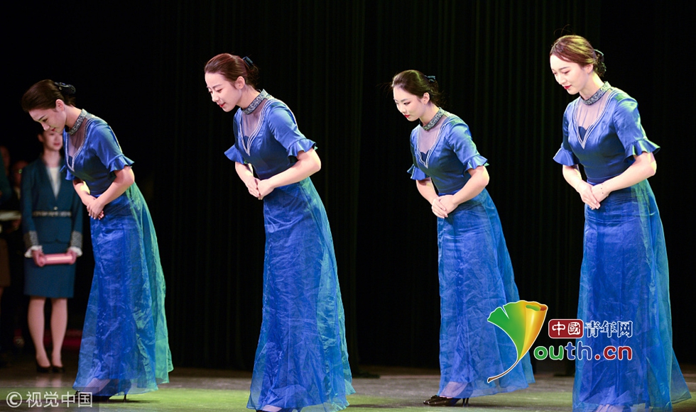 2018年10月15日,杭州,第五屆世界互聯(lián)網(wǎng)大會(huì)召開在即,來自浙江傳媒學(xué)院的禮儀志愿者們正在進(jìn)行緊張有序的集中訓(xùn)練。圖片作者:浙江日?qǐng)?bào) 馮賀/視覺中國