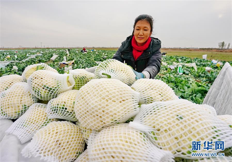 11月5日,唐山海港經(jīng)濟(jì)開發(fā)區(qū)王灘鎮(zhèn)東高各莊村的菜農(nóng)在收獲菜花。 新華社記者 楊世堯 攝