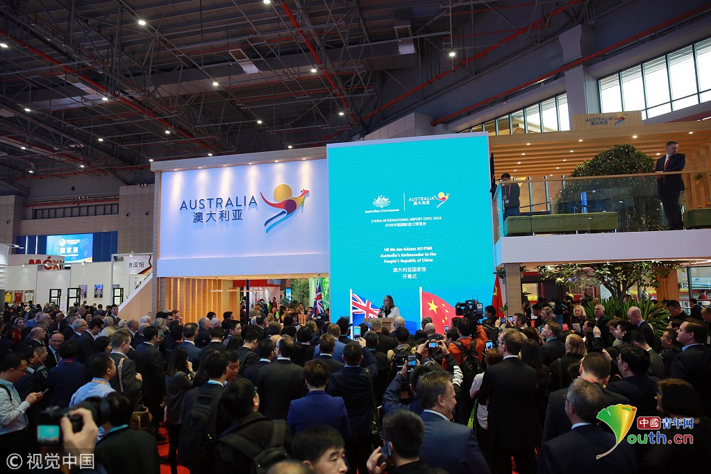 2018年11月6日,上海,首屆中國國際進(jìn)口博覽會(huì)國家展上,共有82個(gè)國家、3個(gè)國際組織設(shè)立了71個(gè)展臺(tái)。澳大利亞館新產(chǎn)品、新技術(shù)發(fā)布。視覺中國
