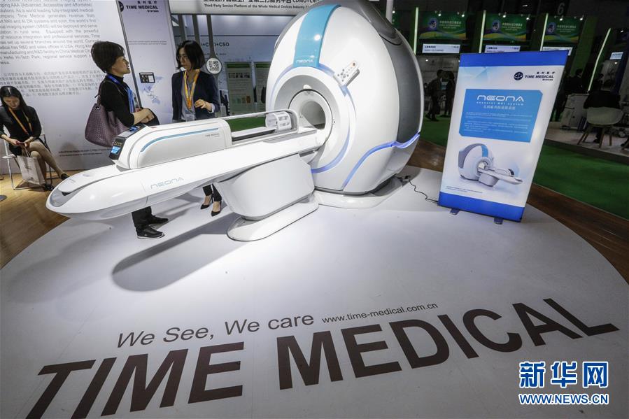 11月6日,美時(shí)醫(yī)療(美國)有限公司工作人員為參觀者介紹世界首臺(tái)嬰幼兒專用核磁共振儀。該設(shè)備填補(bǔ)了這個(gè)領(lǐng)域的市場(chǎng)空白,體型輕巧,成像分辨率高,更方便在新生兒重癥監(jiān)護(hù)室里使用。