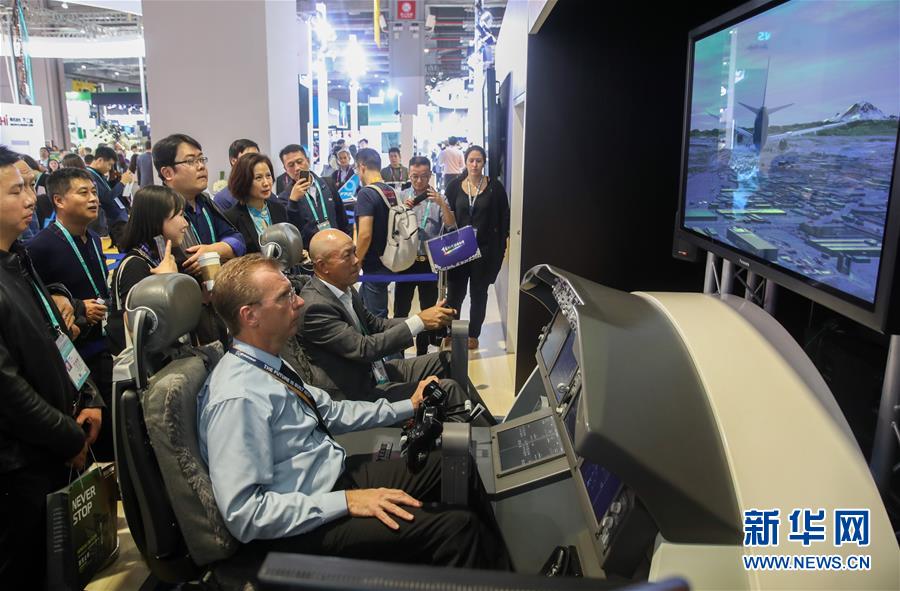 11月6日,參觀者在美國波音公司展臺(tái)體驗(yàn)“駕駛”波音客機(jī)。新華社記者 丁汀 攝