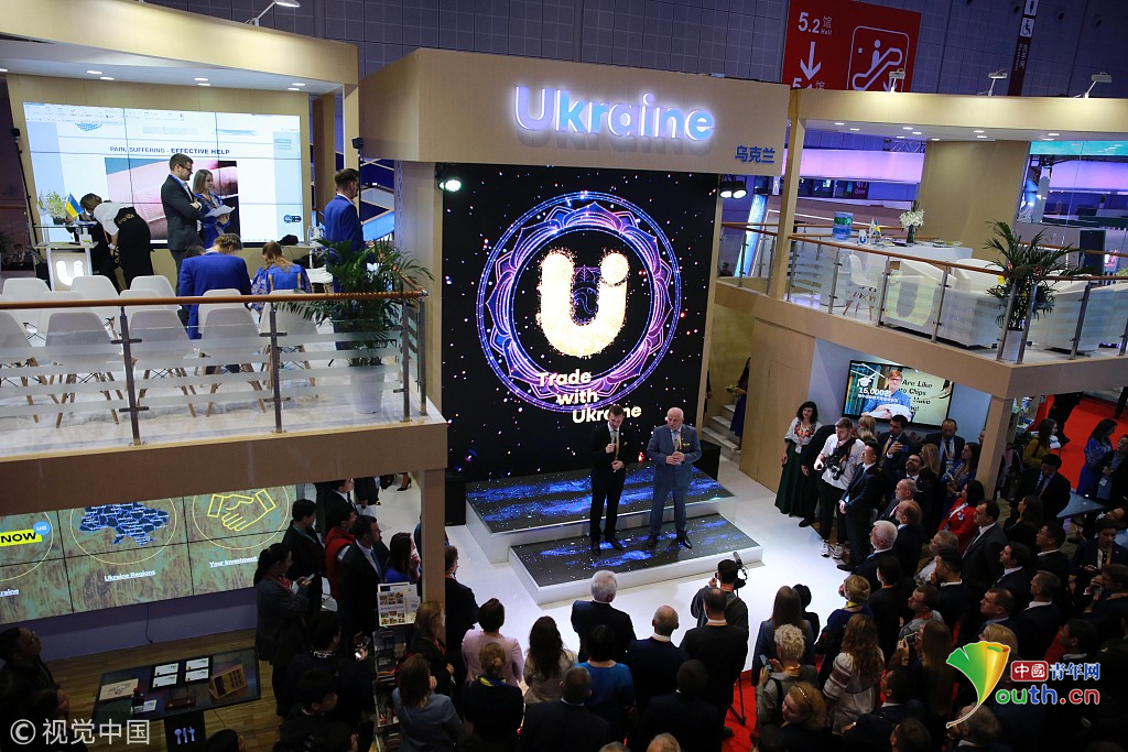 2018年11月6日,上海,首屆中國國際進(jìn)口博覽會(huì)國家展上,共有82個(gè)國家、3個(gè)國際組織設(shè)立了71個(gè)展臺(tái)。烏克蘭館新產(chǎn)品、新技術(shù)發(fā)布。視覺中國