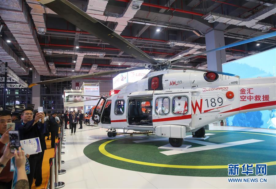 11月6日,觀眾在參觀意大利萊奧納多直升機(jī)公司展出的AW189直升機(jī)。 新華社記者 丁汀 攝