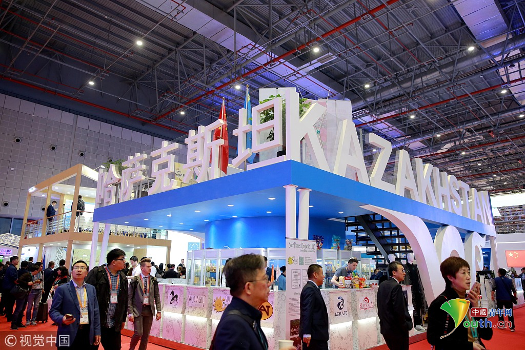 2018年11月6日,上海,首屆中國國際進(jìn)口博覽會(huì)國家展上,共有82個(gè)國家、3個(gè)國際組織設(shè)立了71個(gè)展臺(tái)。哈薩克斯坦館。視覺中國