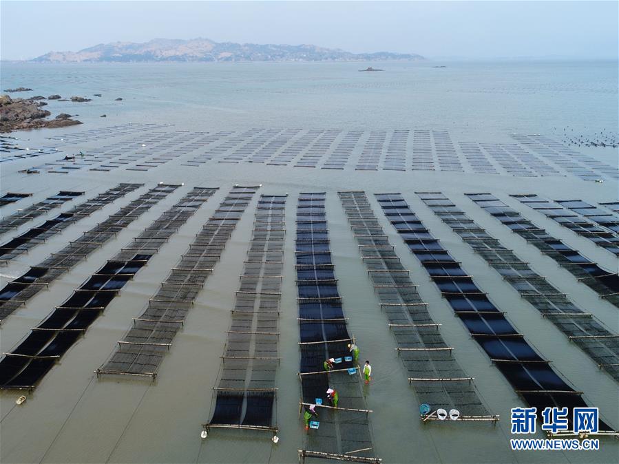 10月24日,福建莆田蔣山村村民在海上收割紫菜(無(wú)人機(jī)拍攝)?! ⌒氯A社記者姜克紅 攝