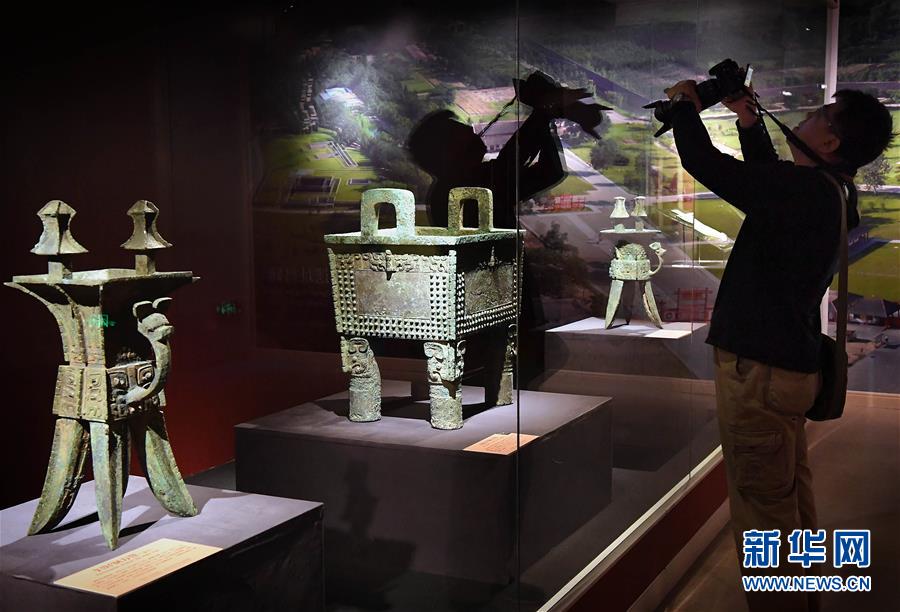 10月12日,參觀者在安陽博物館拍攝展品。目前,“鳳歸大邑商——殷墟婦好文物安陽故里展”正在安陽博物館展出,共展出文物474件。1976年被考古學家發(fā)現(xiàn)的婦好墓,是世界文化遺產(chǎn)、中國商代后期都城遺址——殷墟唯一保存完整的商代王室墓葬。新華社記者李安攝