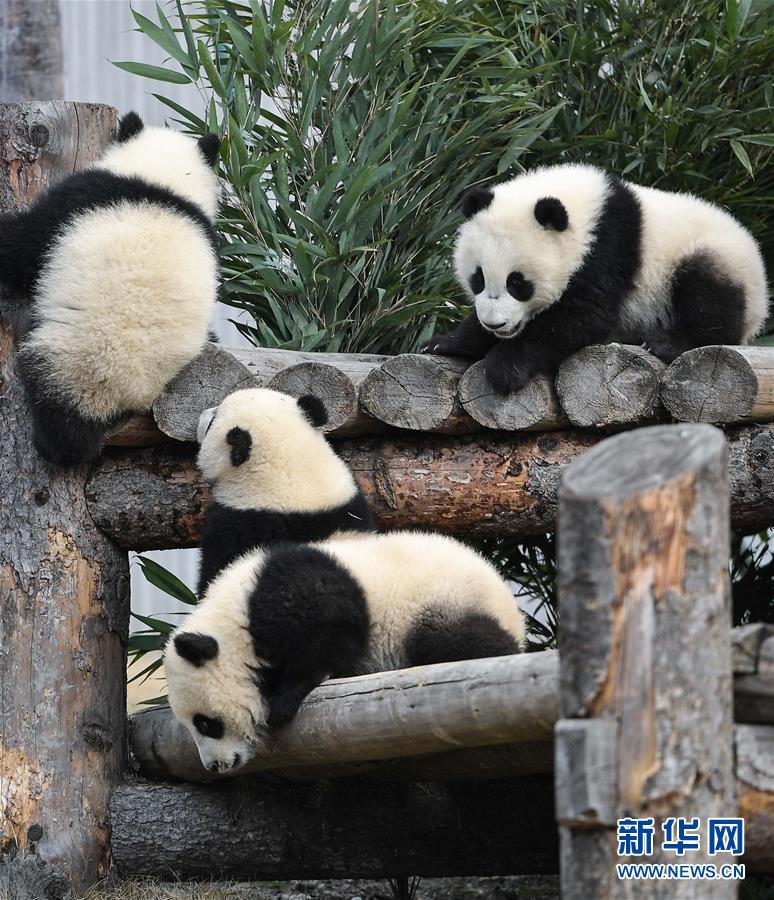 這是在中國(guó)大熊貓保護(hù)研究中心臥龍神樹(shù)坪基地拍攝的三只大熊貓(2018年4月25日攝)。 新華社記者 薛玉斌 攝
