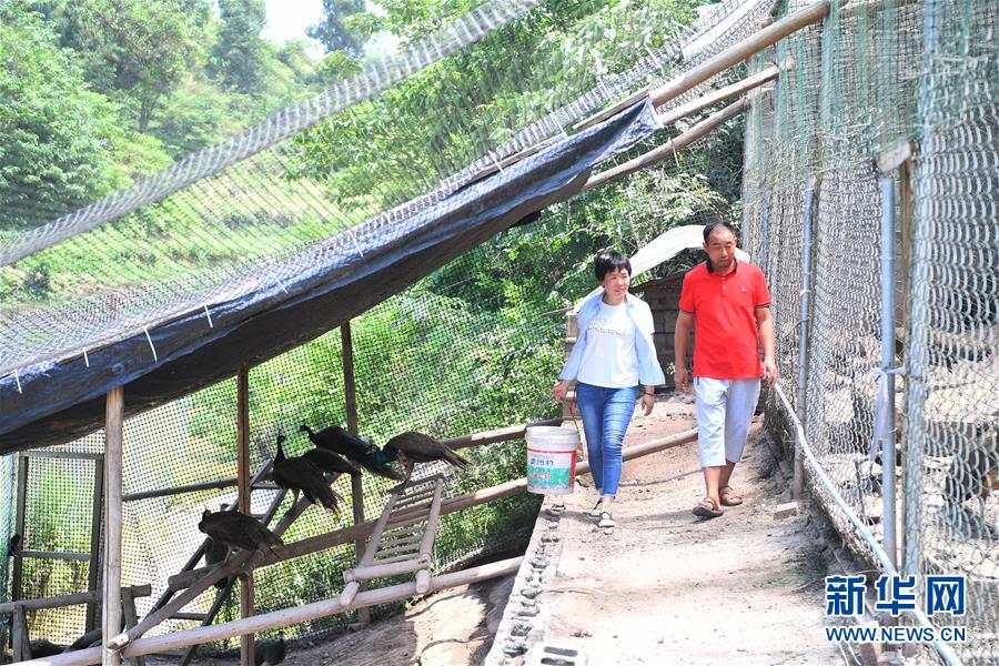 5月16日,在重慶市銅梁區(qū)永嘉鎮(zhèn)高龍村,閻仁兵(右)和妻子張榮蘋在養(yǎng)殖場(chǎng)內(nèi)巡視藍(lán)孔雀生長(zhǎng)情況。