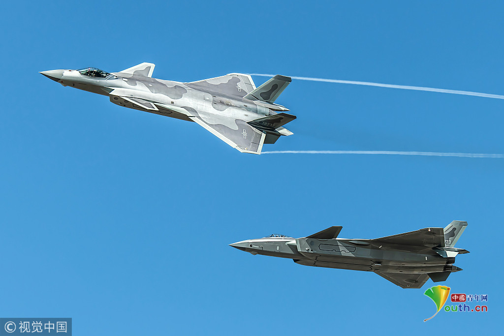 圖七:2018年11月6日,廣東珠海航展上,兩架殲-20戰(zhàn)機(jī)組成雙機(jī)編隊(duì)進(jìn)行飛行表演。