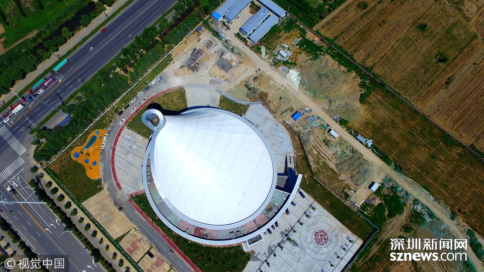 2018年6月13日,航拍河南淮陽一座即將竣工落成的體育場(chǎng)館建筑,市民稱酷似一個(gè)石磨盤。