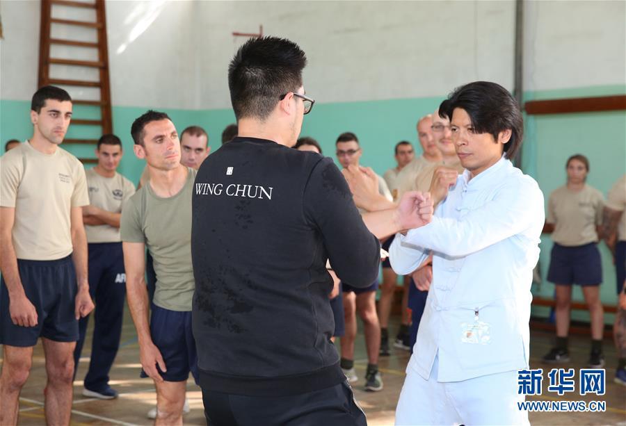 11月13日,在馬耳他首都瓦萊塔,鄭祖杰(前右)向馬耳他士兵展示詠春拳。 當(dāng)日,中國國家級非物質(zhì)文化遺產(chǎn)詠春拳代表性傳承人鄭祖杰走進馬耳他武裝部隊,向官兵展示詠春拳。這一活動是馬耳他中國文化中心與馬耳他武術(shù)協(xié)會合辦的詠春拳系列展示活動之一。 新華社記者 袁韻 攝