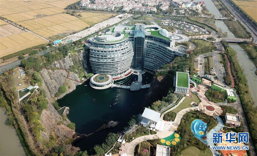 這是位于上海松江佘山腳下的世茂洲際酒店(11月13日無人機拍攝)。 位于上海松江的世茂洲際酒店11月15日正式開門營業(yè)。這家在一個廢棄采石礦坑內建成的酒店成為上海又一新景。 新華社記者 方喆 攝
