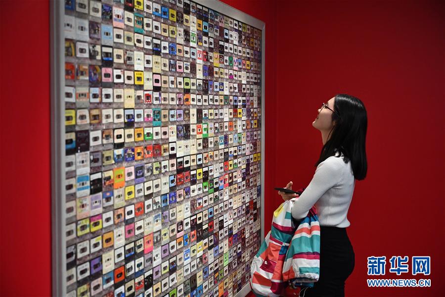 11月15日,一名參觀者在“時光博物館”里觀看懷舊磁帶墻。