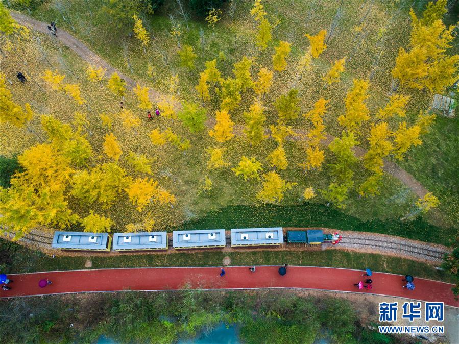 一列觀光小火車帶著游客穿行在銀杏林里(11月16日無人機(jī)拍攝)。近日,在浙江省長興縣小浦鎮(zhèn),“十里銀杏長廊”和近千畝花海經(jīng)過近一年的升級改造后,以嶄新的面貌與游客見面?;ê!⒂^光小火車、古村民宿、銀杏長廊等旅游項(xiàng)目全面提升了小浦鎮(zhèn)鄉(xiāng)村旅游的品質(zhì)。新華社記者 徐昱 攝