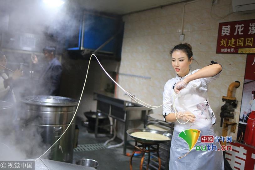 2018年11月19日,成都,繼“妖嬈拉面哥”之后,黃龍溪古鎮(zhèn)一個身材高挑的古裝美女,一邊跳舞一邊揮甩著手中的面條被贊“甩面仙子”走紅網(wǎng)絡。圖片作者:紅葉/視覺中國