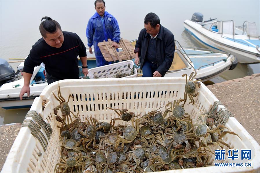 11月6日,在江西省南昌市進(jìn)賢縣軍山湖大閘蟹養(yǎng)殖水域,當(dāng)?shù)厮a(chǎn)養(yǎng)殖公司的工作人員將捕撈的大閘蟹搬運上岸。 新華社記者彭昭之?dāng)z