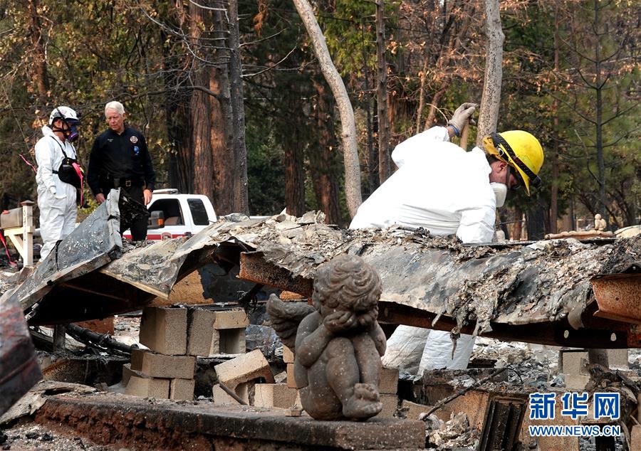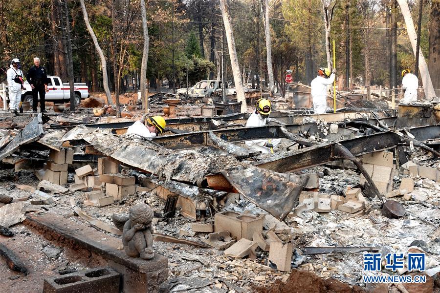 11月13日,在美國加利福尼亞州天堂鎮(zhèn),搜救人員在山火過后的廢墟工作。