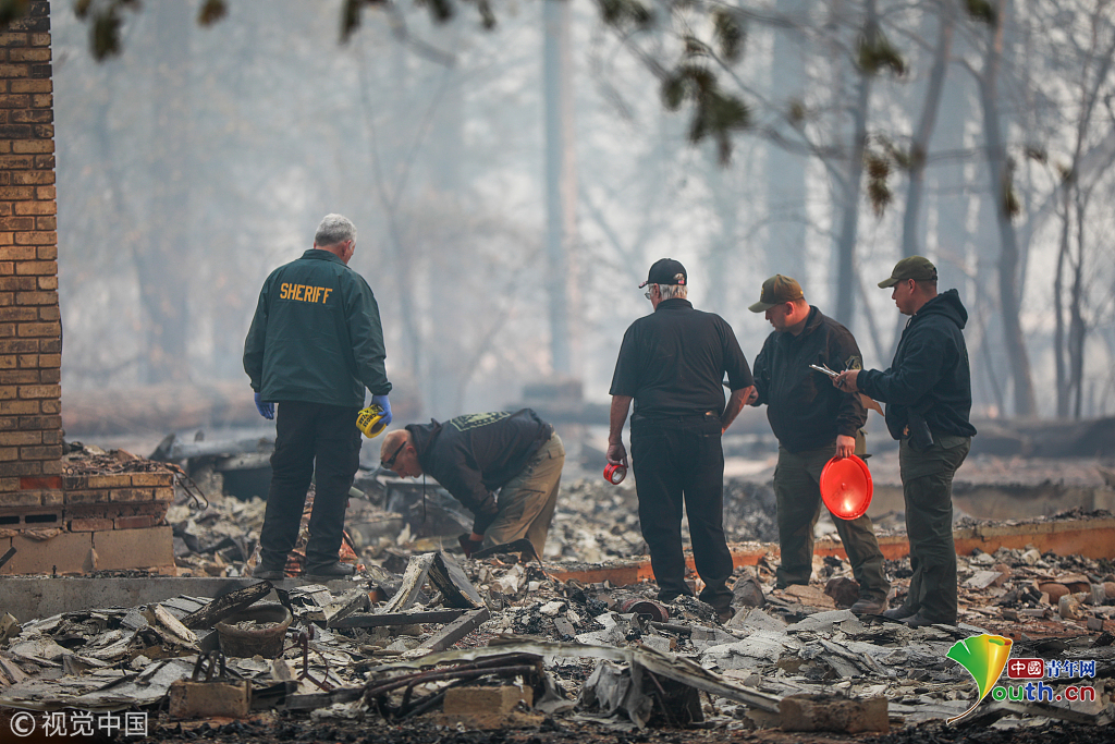 11月19日,在美國加利福尼亞州比尤特縣天堂鎮(zhèn),救援人員在山火廢墟中工作。