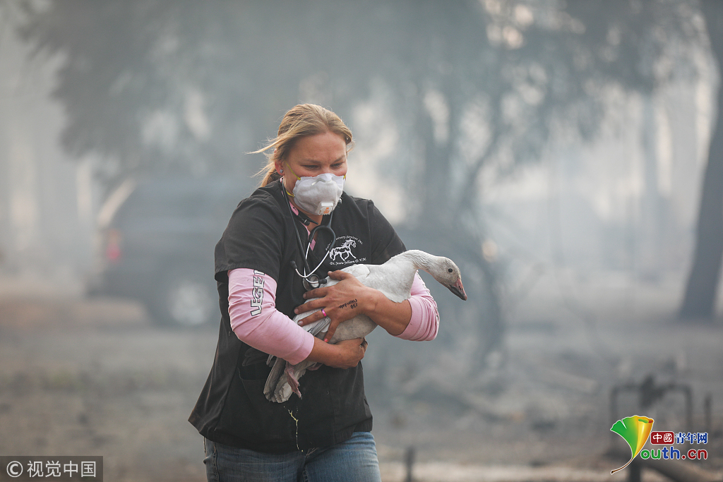 當(dāng)?shù)貢r(shí)間2018年11月10日,美國加州Paradise,當(dāng)?shù)厣交鹚僚?,?zāi)區(qū)民眾紛紛帶領(lǐng)家畜進(jìn)行轉(zhuǎn)移。自本周三開始,加州多地發(fā)生山火,火勢蔓延迅猛,數(shù)萬人被迫撤離,數(shù)以萬計(jì)的房屋被燒毀。圖片作者:Jessica Christian