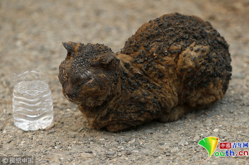 這場美國史上最嚴(yán)重山火導(dǎo)致7700多所房屋被毀,5萬多人流離失所。一只被燒傷的貓?jiān)诘却齽?dòng)物管理局到來救助。