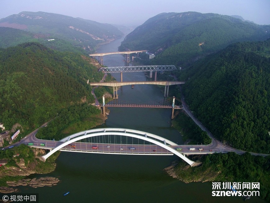 畫面中由近及遠分別是新朝陽橋、老朝陽橋、遂渝鐵路橋、襄渝鐵路橋、蘭渝鐵路橋。