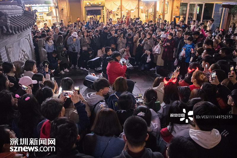 2018年4月6日晚,清明小長假的第二天,在山東省濟(jì)南市復(fù)古老街區(qū)寬厚里,暫停演出有段時(shí)日的網(wǎng)紅歌唱組合“連音社”悄然復(fù)出,吸引了當(dāng)?shù)匾约皝碜匀珖鞯赜慰偷膰^。