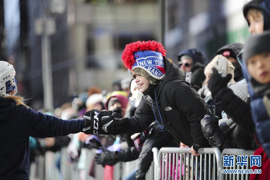 11月22日,在美國紐約感恩節(jié)大游行上,一名觀看游行的男孩與演員擊掌。