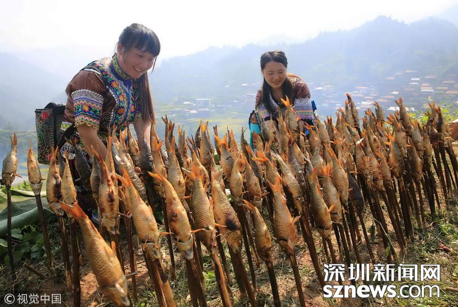 廣西柳州市融水縣山區(qū)有插秧時(shí)節(jié)放養(yǎng)鯉魚(yú)苗的習(xí)俗,金秋時(shí)節(jié)稻熟魚(yú)肥,收稻燒魚(yú)成為別致一景。