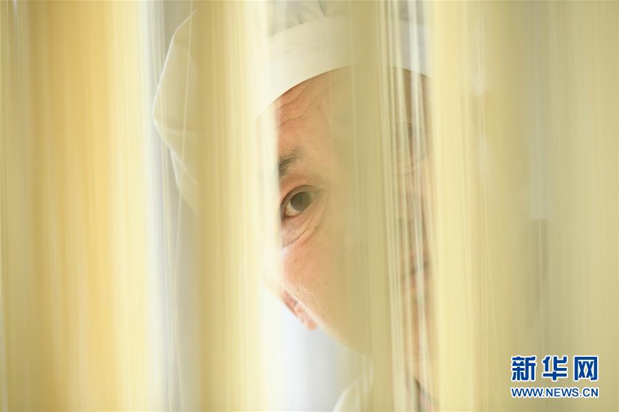 11月23日,在石家莊市藁城區(qū)耿家莊村某宮面生產(chǎn)廠,工人演示用空心的藁城宮面吹水泡。