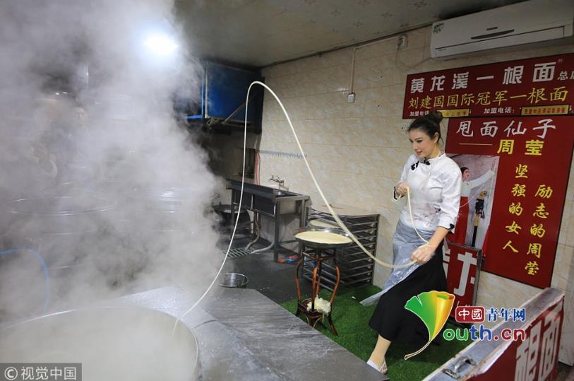 2018年11月19日,成都,繼“妖嬈拉面哥”之后,黃龍溪古鎮(zhèn)一個身材高挑的古裝美女,一邊跳舞一邊揮甩著手中的面條被贊“甩面仙子”走紅網(wǎng)絡(luò)。圖片作者:紅葉/視覺中國