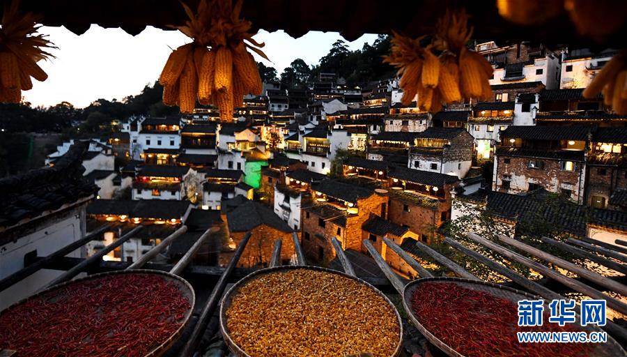 這是黃昏中的篁嶺古村(10月25日攝)。近日天氣晴朗,江西省婺源縣江灣鎮(zhèn)篁嶺村村民抓住時機采摘、晾曬皇菊及蔬果。明黃的菊花、火紅的辣椒……各種顏色將篁嶺古村裝扮成巨大的“調(diào)色板”,引來眾多游客感受鄉(xiāng)村美景。新華社記者宋振平 攝
