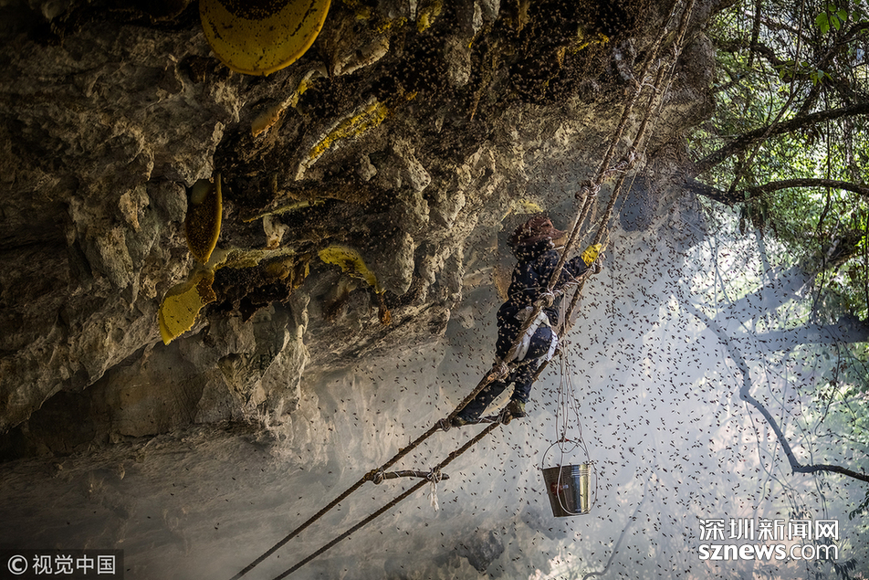 2018年5月10日,云南普洱。 “最難采摘的崖蜜,是凹進懸崖內(nèi)側(cè)3至5米的那種?!眱赡陙?,小蕊親自跟采了十幾趟蜜,最怕遇到凹陷的蜜源。