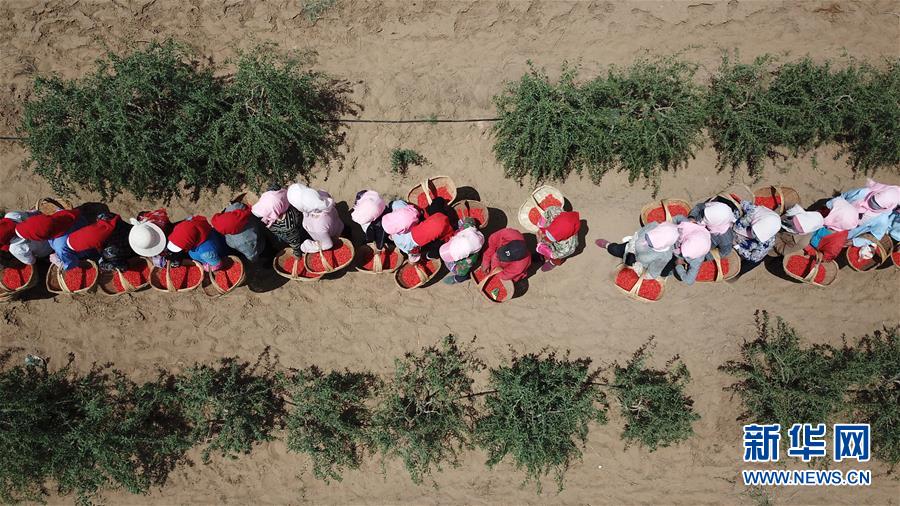 紅寺堡生態(tài)移民區(qū)的移民在百瑞源枸杞種植基地采摘頭茬枸杞(5月30日無人機拍攝)。近日,在寧夏吳忠市紅寺堡區(qū)百瑞源枸杞種植基地,頭茬枸杞迎來采摘收獲季。今年頭茬枸杞采摘期比往年提前20天左右。據(jù)了解,該基地地處紅寺堡生態(tài)移民區(qū),占地3000畝,采摘季節(jié)每天有數(shù)百名當?shù)匾泼裨谔镩g采摘勞作。新華社記者王鵬 攝