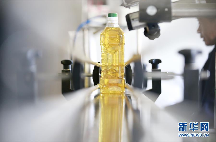 11月23日,在廣西柳州三江侗族自治縣一家生物科技公司,工作人員在茶油灌裝生產(chǎn)線上忙碌。新華社記者任正來攝