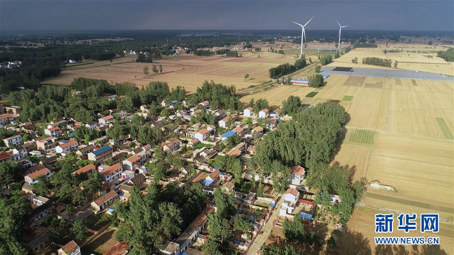 這是6月20日無(wú)人機(jī)拍攝的河南蘭考縣東壩頭鄉(xiāng)張莊村周圍的麥田和風(fēng)機(jī)。新華社記者馮大鵬攝