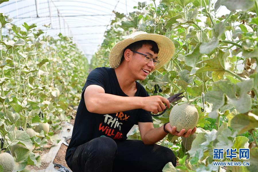 在河南蘭考縣東壩頭鄉(xiāng)張莊村,一位農(nóng)民在塑料大棚中采摘蘭考蜜瓜(6月20日攝)。新華社記者馮大鵬攝