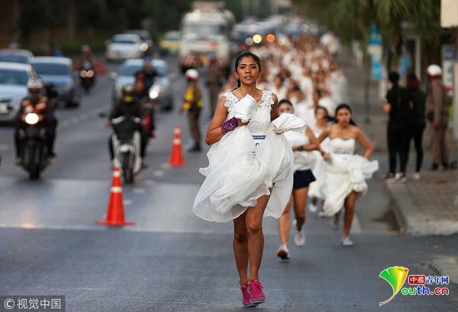 當(dāng)?shù)貢r間2018年11月24日,泰國曼谷舉辦新娘賽跑活動,獲勝者將獲得婚禮的全額資助,眾多新娘在街頭提裙狂奔。圖片來源:視覺中國