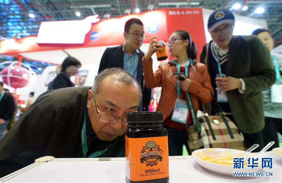在首屆中國國際進(jìn)口博覽會上,參觀者在睦朋得野生蜂蜜有限公司展臺觀看蜂蜜展品(11月8日攝)。 新華社記者 程麗 攝