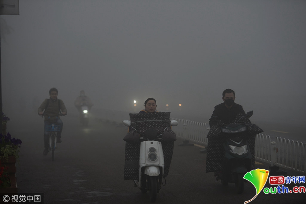 2018年11月26日,全國(guó)多地出現(xiàn)大霧天氣。安徽亳州,市民在大霧彌漫的街頭出行。