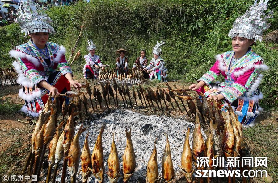 廣西柳州市融水縣山區(qū)有插秧時節(jié)放養(yǎng)鯉魚苗的習(xí)俗,金秋時節(jié)稻熟魚肥,收稻燒魚成為別致一景。