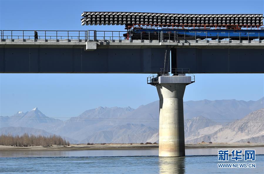 11月26日,施工人員在川藏鐵路拉林段貢嘎雅魯藏布江特大橋上鋪軌。 新華社記者 覺果 攝