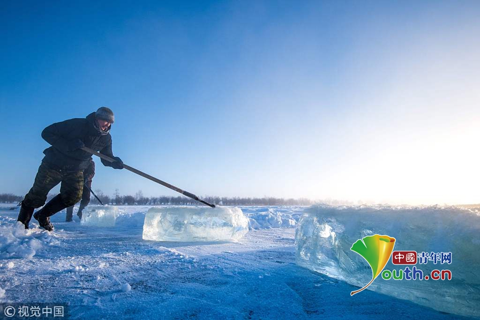 當(dāng)?shù)貢r(shí)間2018年11月27日,雅庫茨克,零下41攝氏度左右的氣溫下,村民在當(dāng)?shù)氐囊粋€湖中采集冰塊。當(dāng)?shù)睾芏嗳艘蕾囉谌诨鶋K解決供水,因?yàn)槎嗄陜鐾粮采w地區(qū)冬季氣溫極低,沒有其他的方式供應(yīng)水。