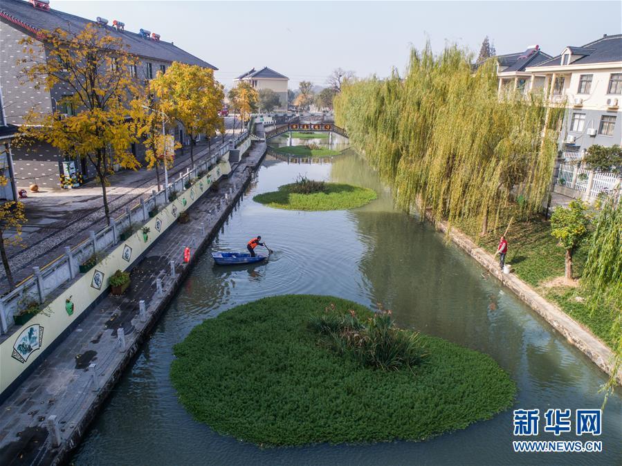 11月28日,長(zhǎng)興縣虹星橋鎮(zhèn)港口村東港內(nèi),河長(zhǎng)孫根法在打撈水面漂浮物(無人機(jī)拍攝)。東港全長(zhǎng)1500米,環(huán)繞港口新村。2012年,新村建成后,港口村通過加固河岸、清理河道、種植浮草等方式對(duì)東港進(jìn)行生態(tài)治理,并由該村黨總支書記孫根法擔(dān)任河長(zhǎng),定期開展巡查,引導(dǎo)村民自覺維護(hù)河道整潔。 新華社記者 徐昱 攝