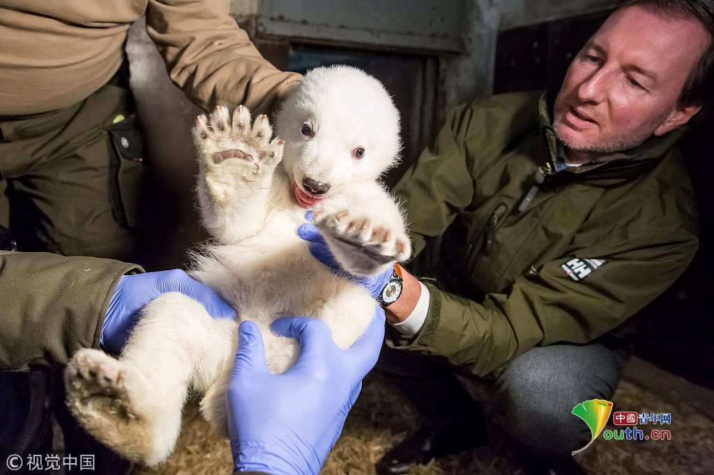 當(dāng)?shù)貢r間2017年1月12日,德國柏林,柏林蒂爾加滕動物園為一只雄性北極熊寶寶檢查身體。熊寶寶于2016年11月3日出生,身高67厘米,體重4.6千克。