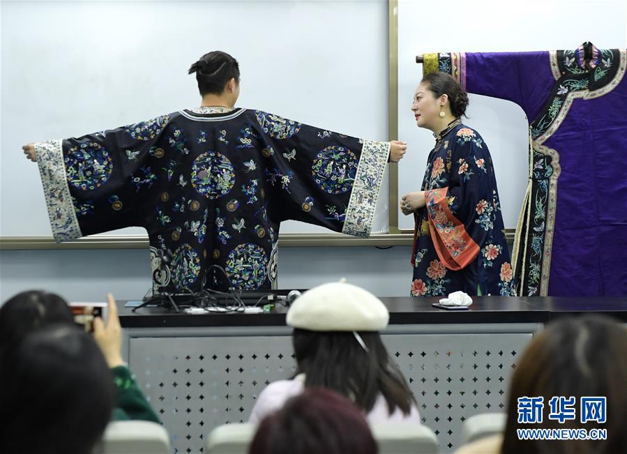 當(dāng)日,一場別開生面的清代古典服裝課在北京服裝學(xué)院舉行。古典美衣收藏家、服裝設(shè)計(jì)師畢紅攜帶她珍藏的清代女性傳統(tǒng)服裝精品來到北京服裝學(xué)院與師生見面。