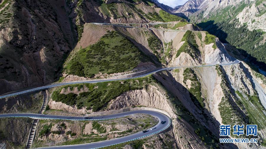 獨(dú)庫(kù)公路穿越海拔3390米的哈希勒根達(dá)坂(2017年7月13日無(wú)人機(jī)拍攝)。 新華社記者 江文耀 攝
