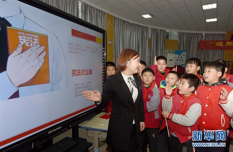12月3日,合肥市經(jīng)開區(qū)明珠居委會法律援助律師在給明珠小學的學生們講解憲法知識。國家憲法日到來之際,各地學校紛紛舉辦主題宣講活動,對學生開展法治教育,幫助孩子們了解憲法知識。新華社記者 郭晨 攝